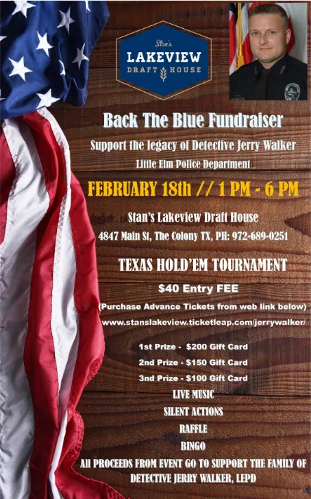 On Saturday – February 18 from 1pm – 6pm, Stan’s Lakeview Drafthouse will be hosting an event to honor Little Elm fallen hero, Jerry Walker. All proceeds from the event will go to benefit Jerry Walker’s family. Stan’s Lakeview Drafthouse is located at 4847 Main Street, The Colony.