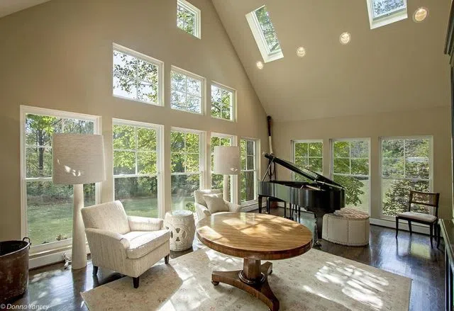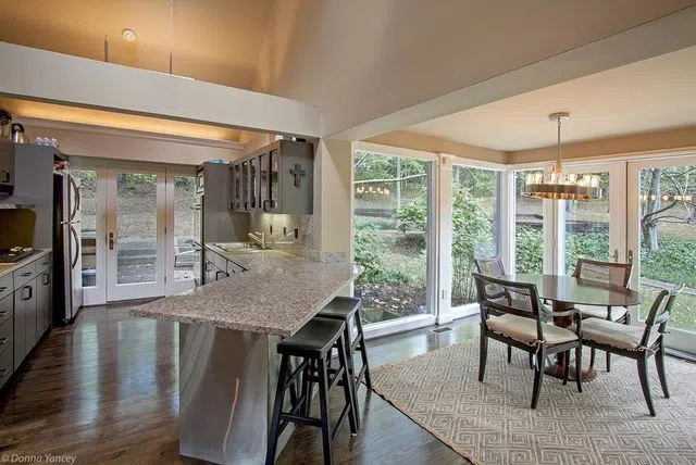 The farmhouse sits on a hill top, which provides amazing views of the country side. It is equipped with has four beds, four baths, and two half-baths. There’s a formal living room with vaulted ceiling and skylights, a cozy family room with fireplace, and a kitchen with casual eating area.