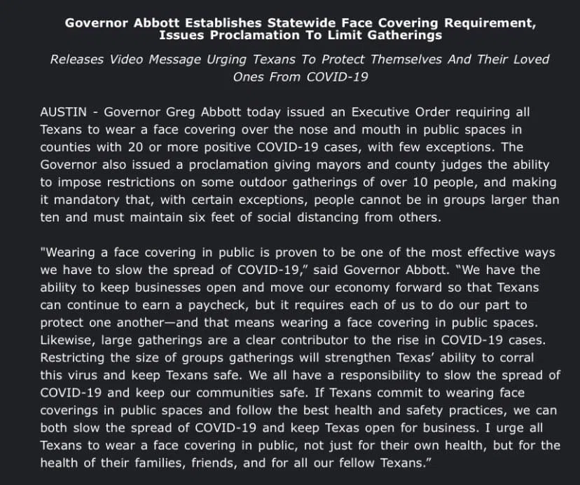 Gov Abbott Issues Statewide Mask Mandate