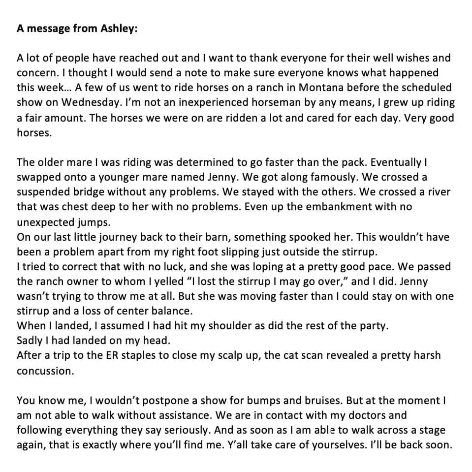 Ashley is postponing shows this weekend due to the severity of the accident – but she promises fans that as soon as she can be back on stage, she will.