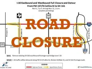 According to TxDOT – Interstate 30 will be closed between FM 157/Collins Street and President George Bush Turnpike from 7 p.m. Friday, Nov. 9 through 5 a.m. Monday, Nov. 12. Traffic will be deto...