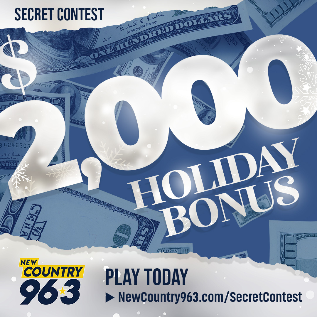 YOU’VE BEEN CHOSEN! To thank you for listening to New Country 96.3, the holiday’s are here and we’re here to help! Didn’t get what you wanted for Christmas? Then we’re here to help because we’re giving away a $2,000 Holiday Bonus! The more you listen, the more chances you have to win. There are 12 CHANCES to play every weekday.